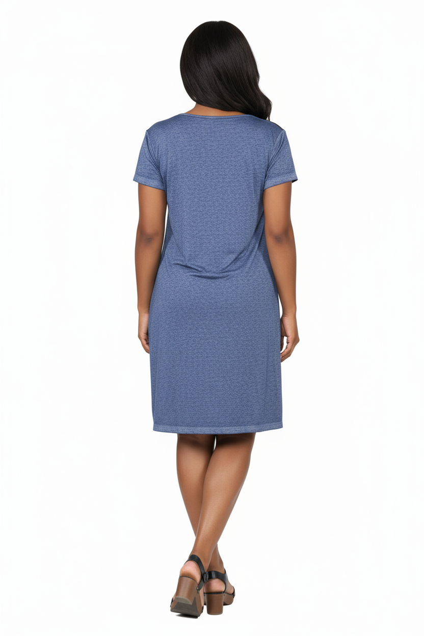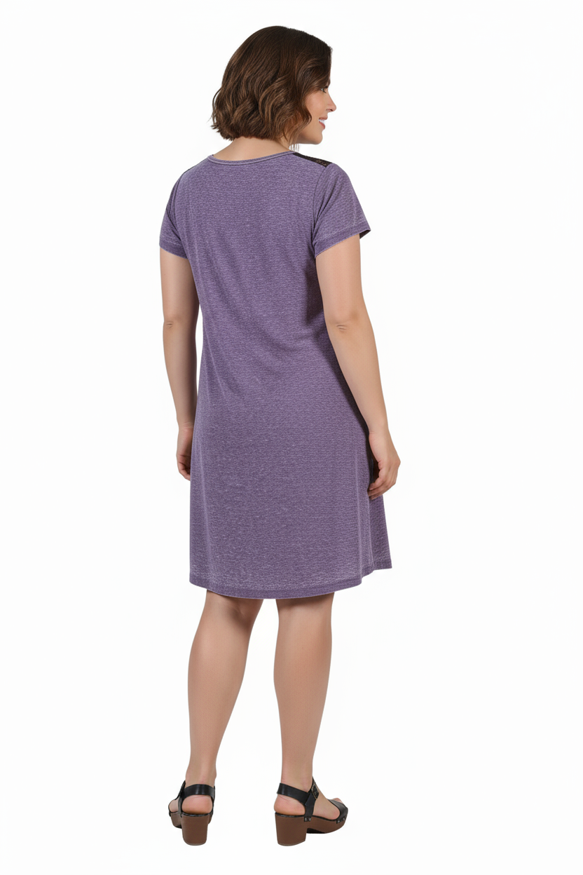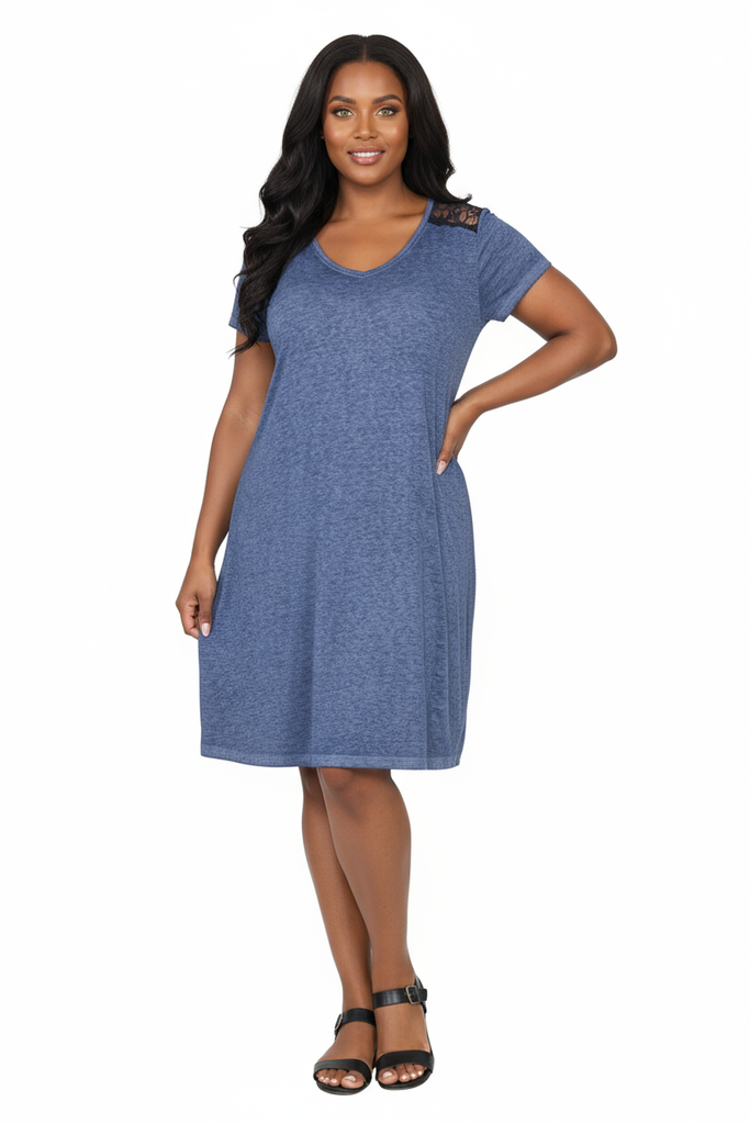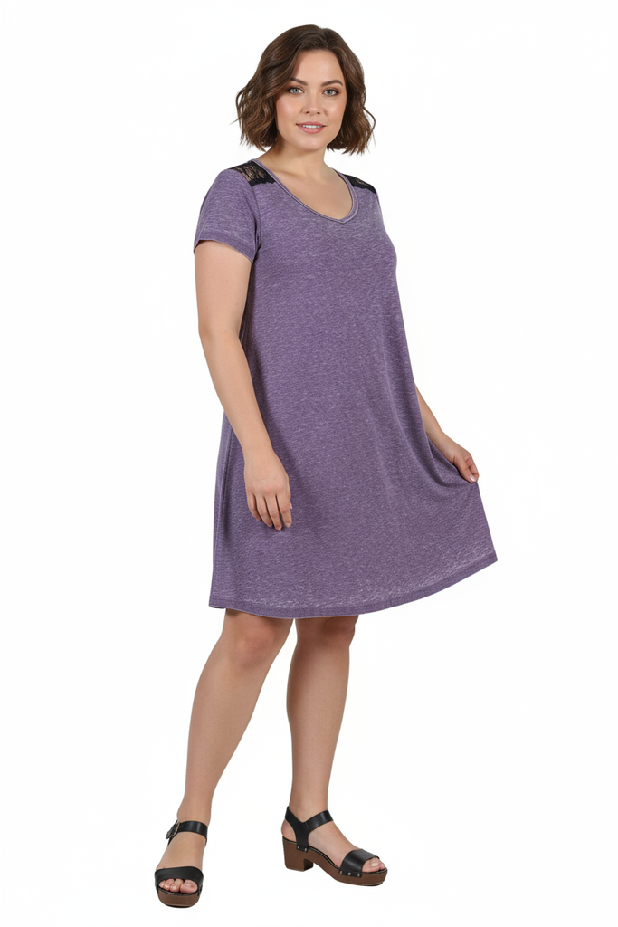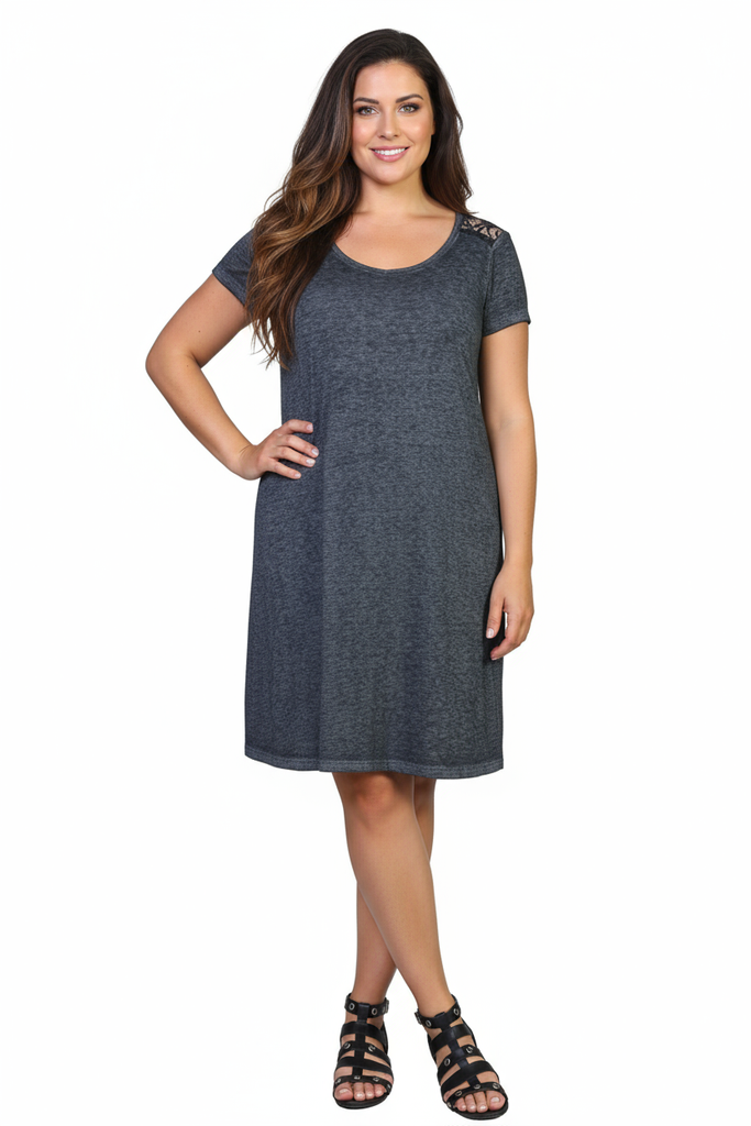 This stylish short sleeve plus size burnout dress is sure to add comfort and style to your wardrobe. Scoop neckline with lace detail at shoulder.