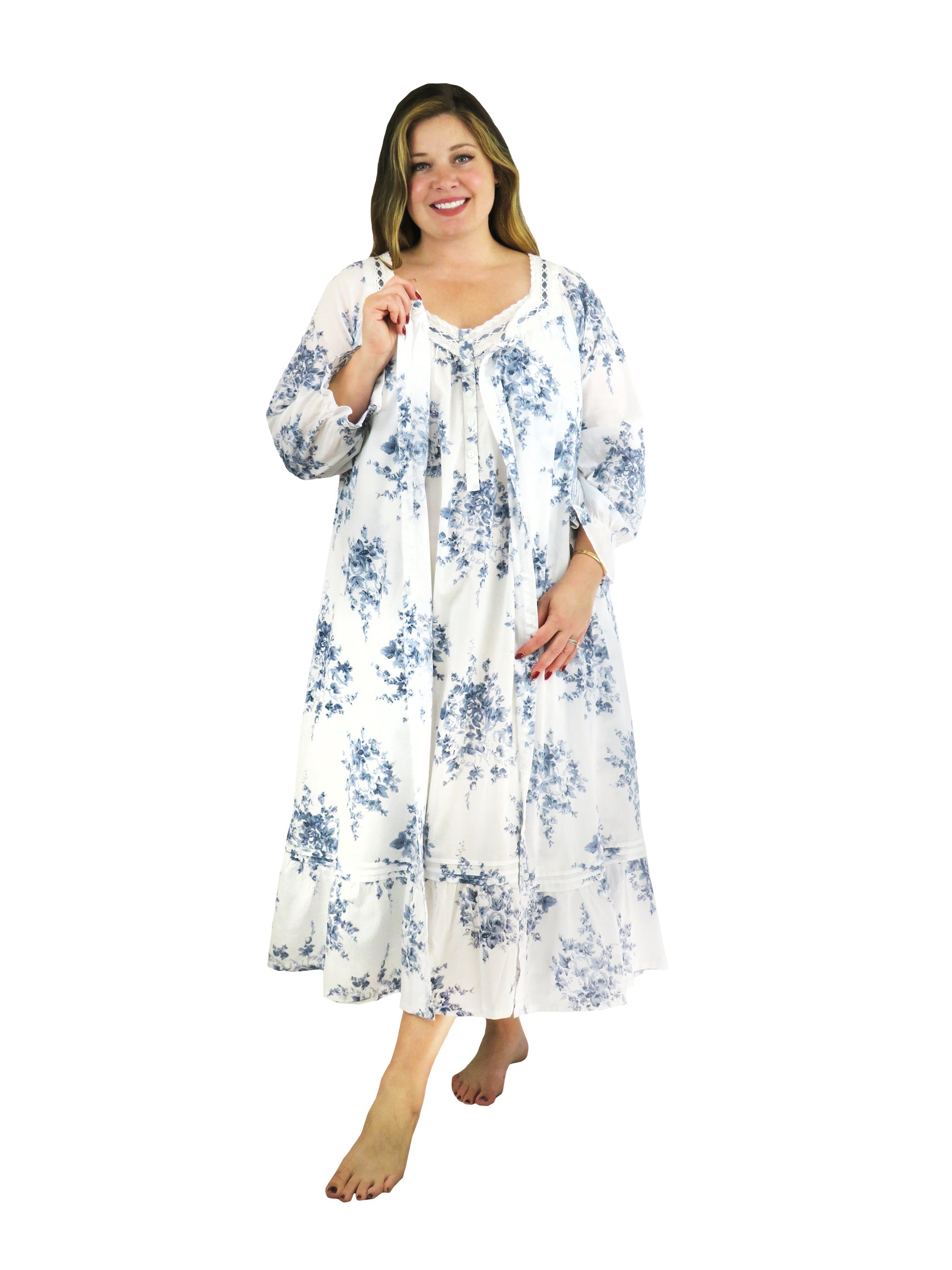100% Cotton Lace Trim Flounce Robe Gown- Blue and White Floral Print