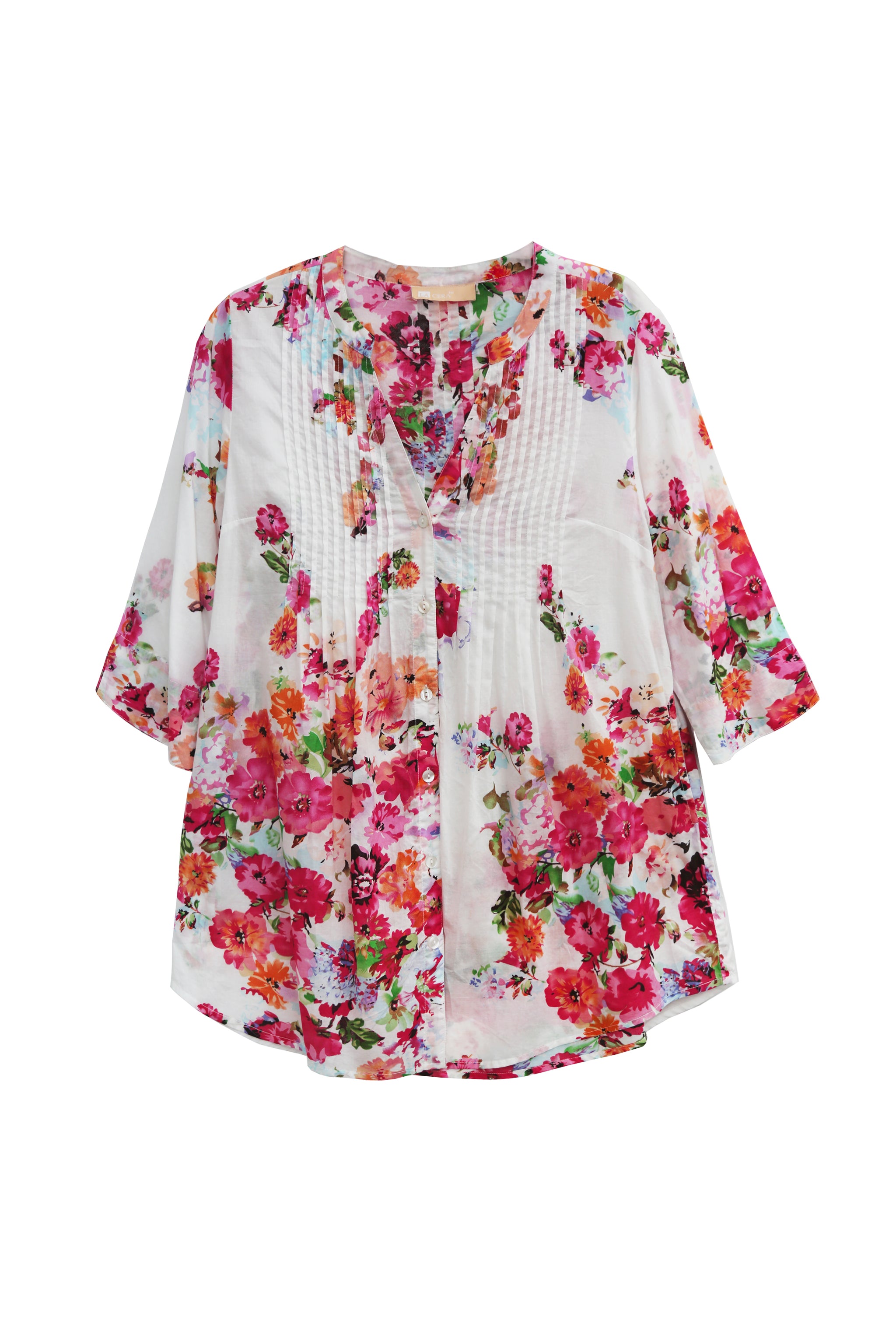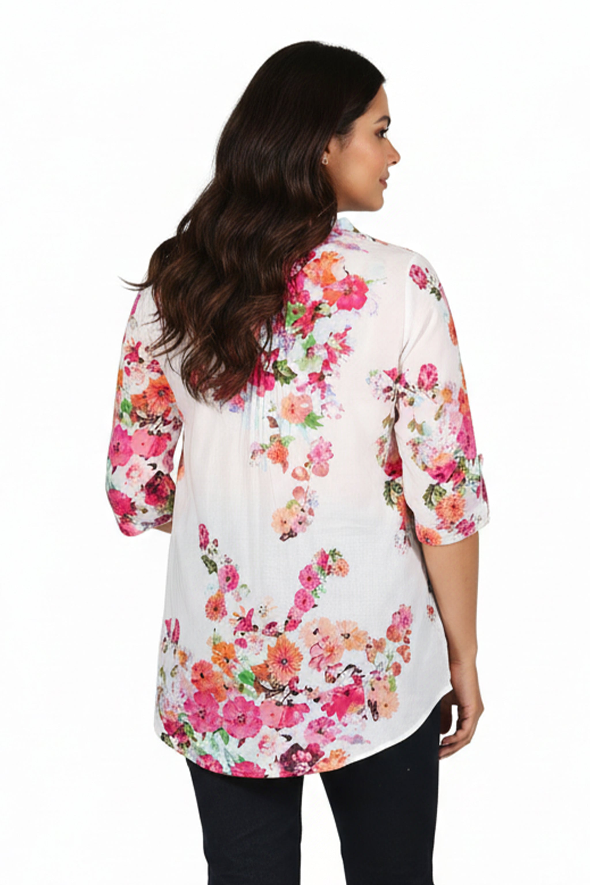 Elevate your wardrobe with La Cera's exquisite Rose & Coral Blossom Tunic. Made from lightweight 100% cotton voile, this tunic features a painterly floral print in shades of rose and coral. The full button front placket and release pleats at the front bodice provide fullness, while the 3/4 sleeves and banded collar add an elegant touch. Complete with side seam pockets for added convenience. Measures 31" from shoulder to hem. Imported.