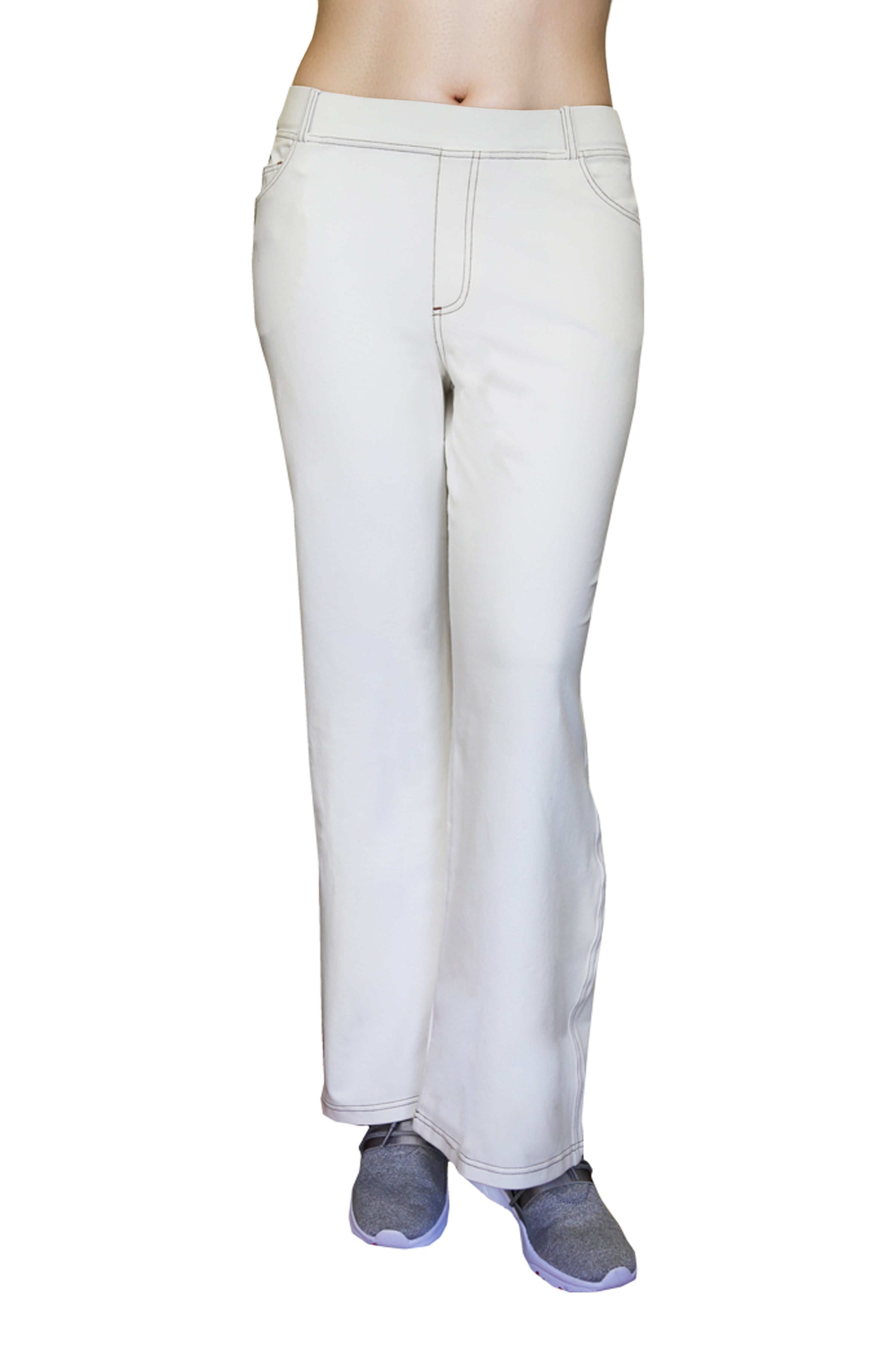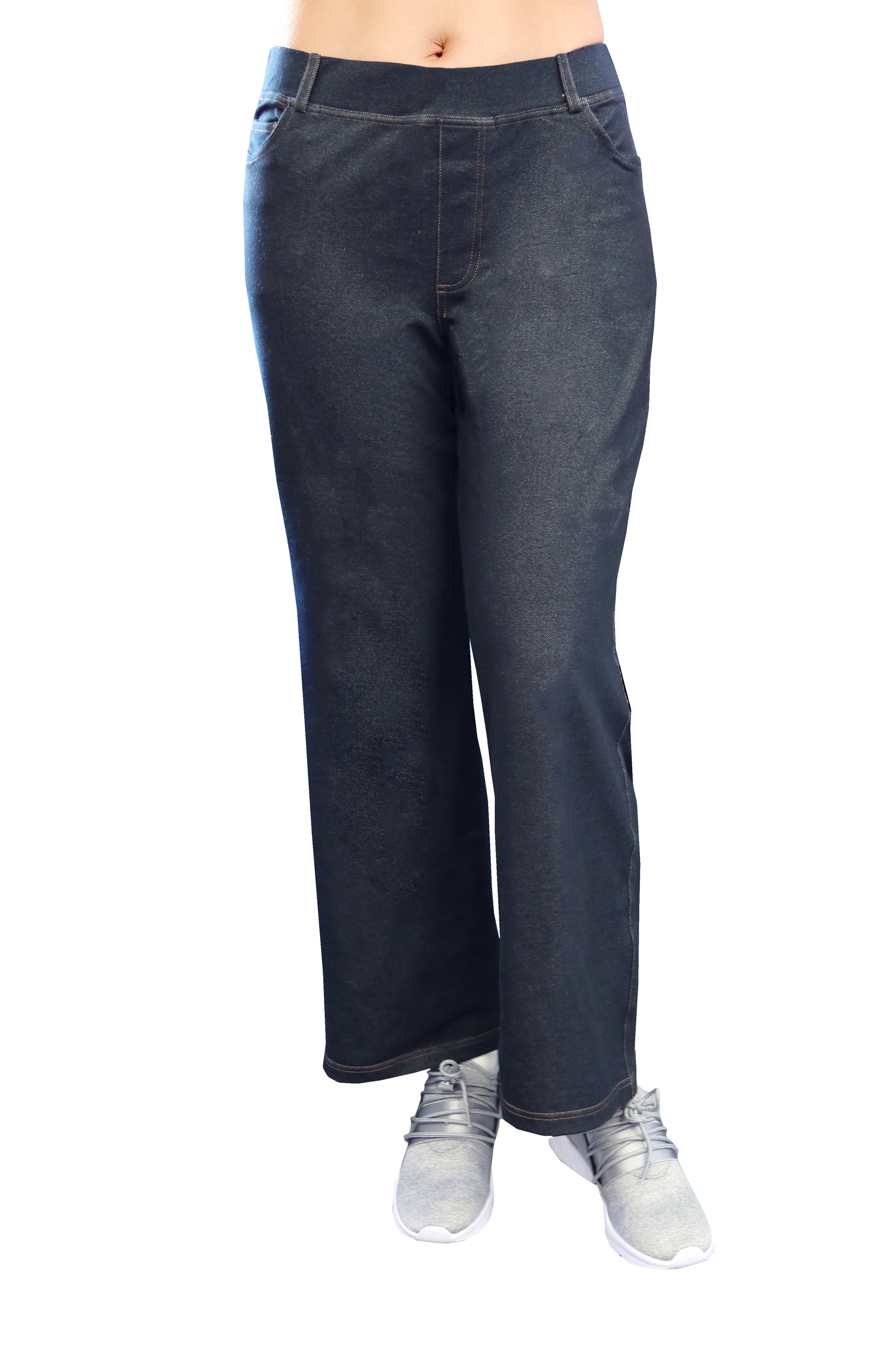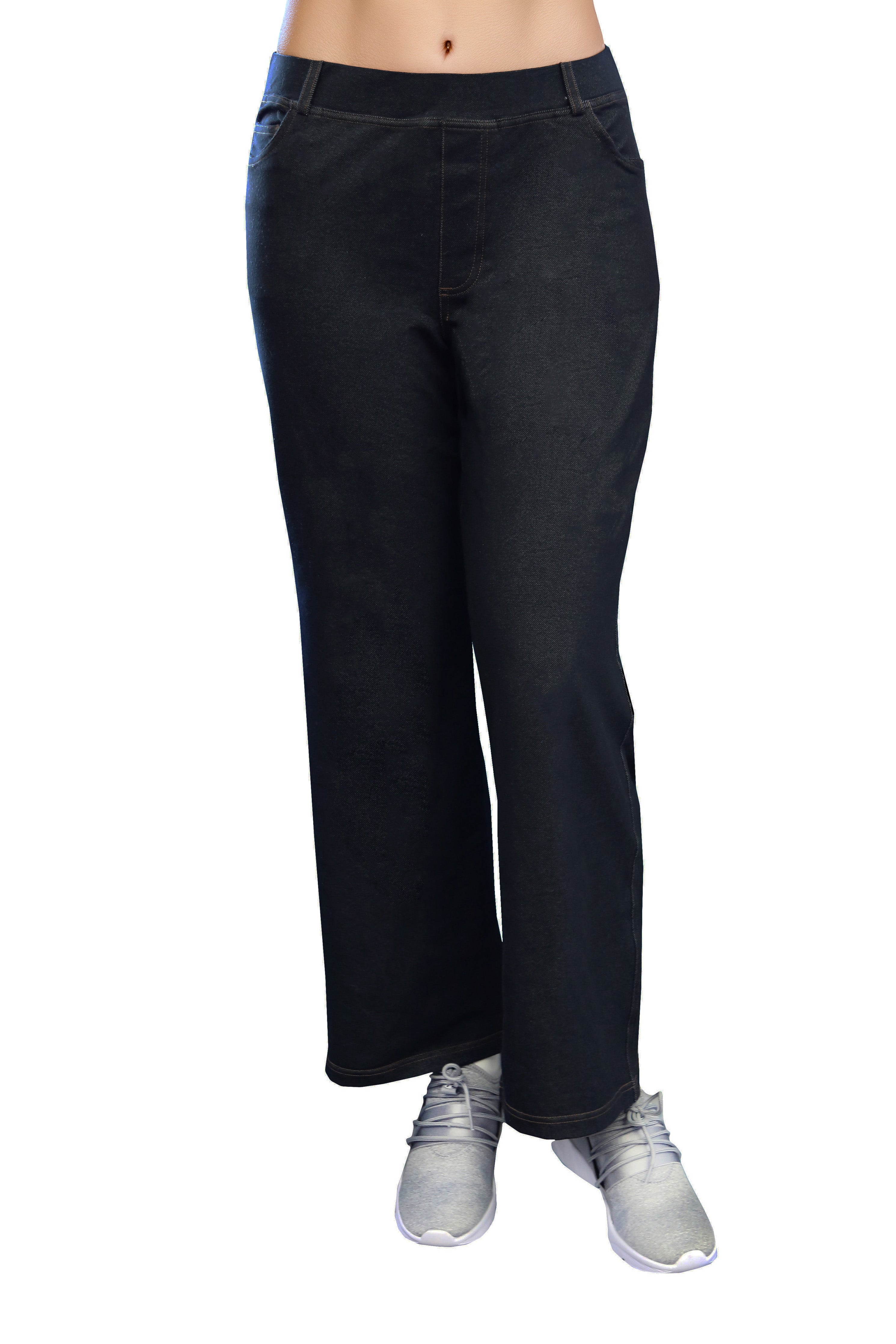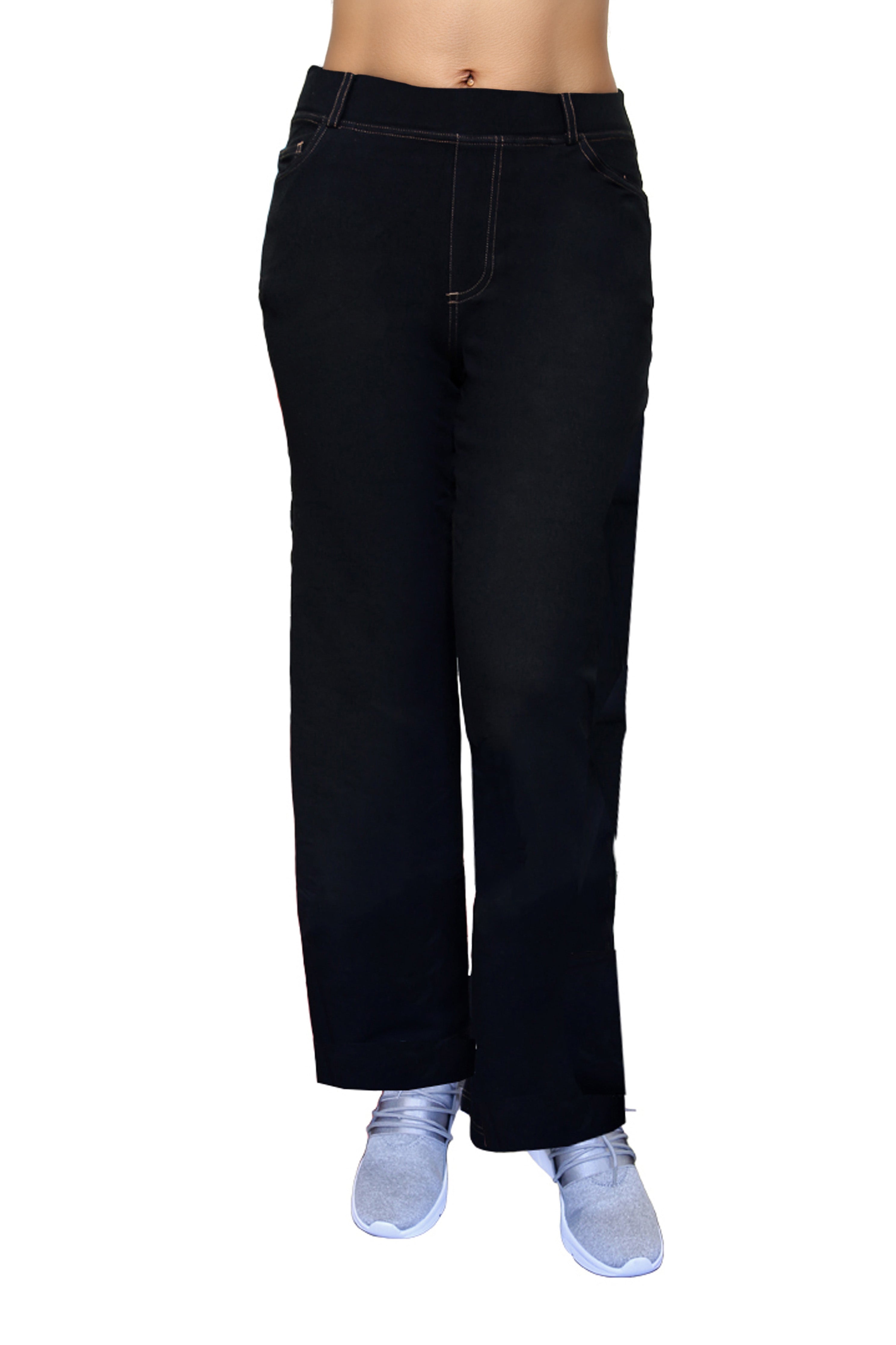 Confeccionado con un tejido elástico increíblemente suave y cómodo, este pantalón tiene la apariencia de mezclilla. Cuenta con una cintura elástica cubierta de 2" con trabillas para cinturón y un práctico estilo de 5 bolsillos con bragueta simulada y costuras en contraste.