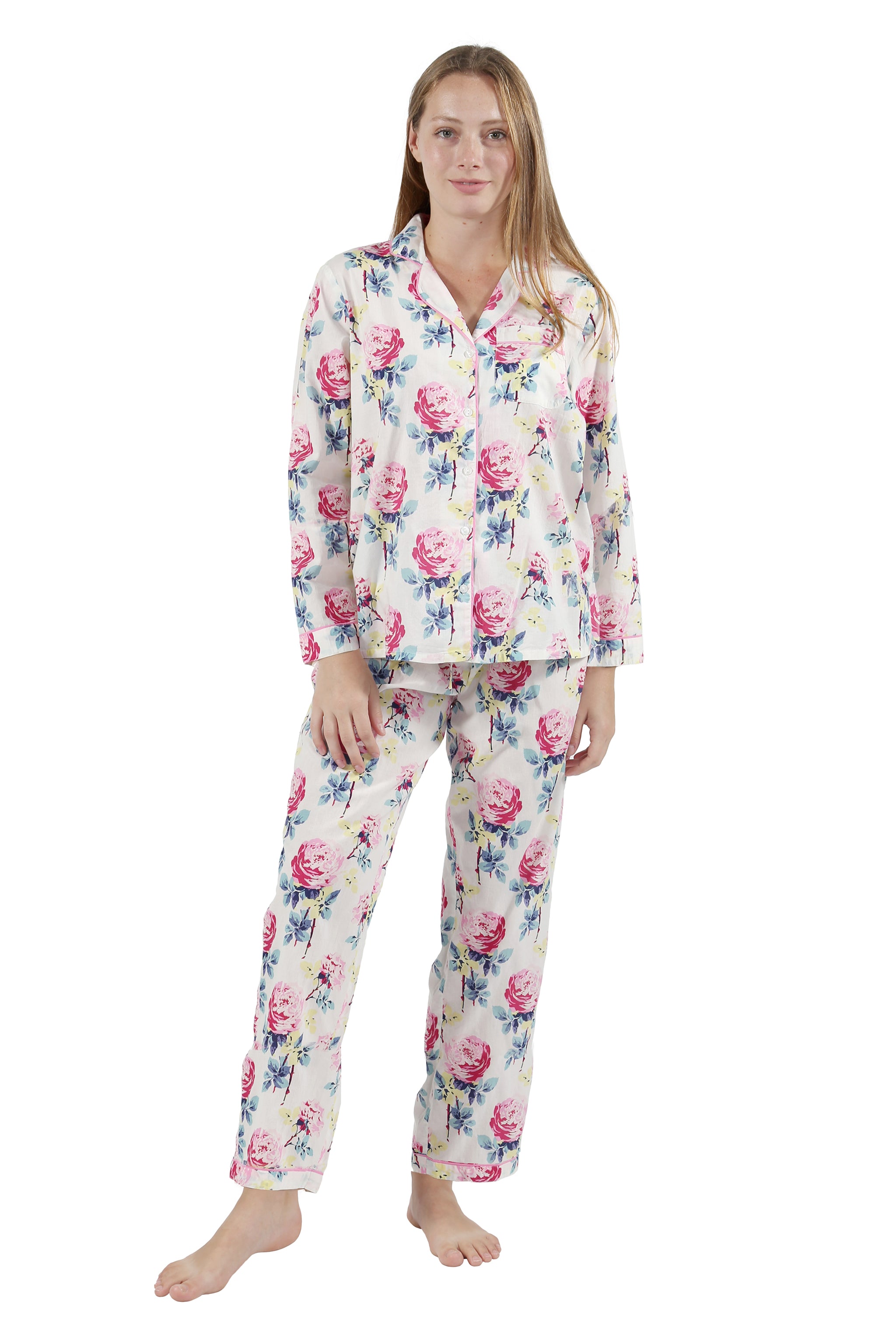 Dormirás como un sueño con este conjunto de pijama de algodón de dos piezas de La Cera. La parte superior con cinco botones en el frente de este conjunto presenta un cuello con muescas con esquinas redondeadas en la solapa y un bolsillo en la parte superior izquierda. Ribete en cuello y puños. Los pantalones cuentan con una cinturilla elástica y un estilo fácil de poner.