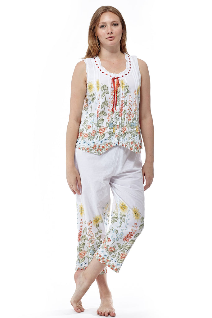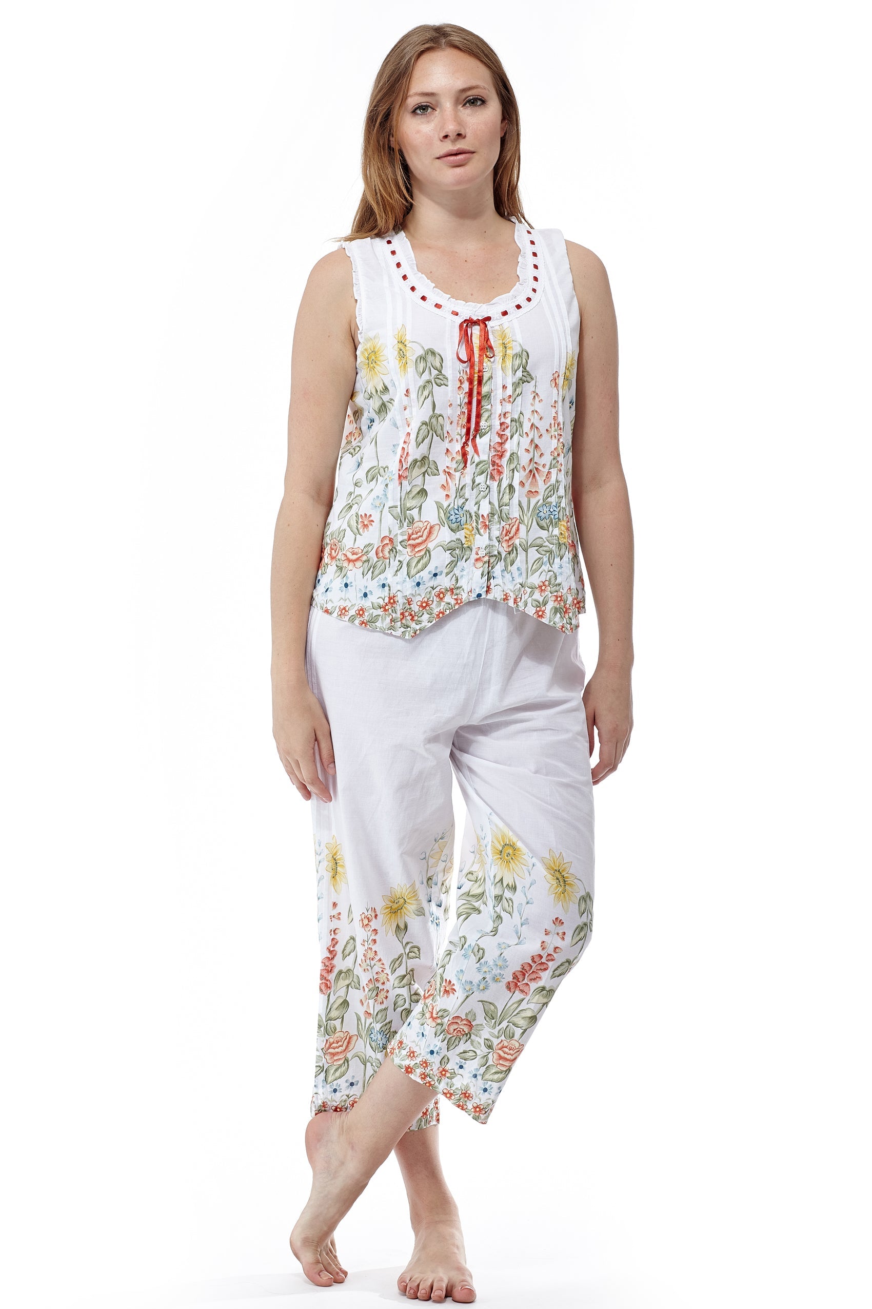 Este hermoso conjunto de pijama con estampado floral presenta una blusa sin mangas con detalle de cinta y cierre de botones y pantalones a juego. Cómodo, ligero y elegante, ¡tu búsqueda del pijama perfecto ha terminado!