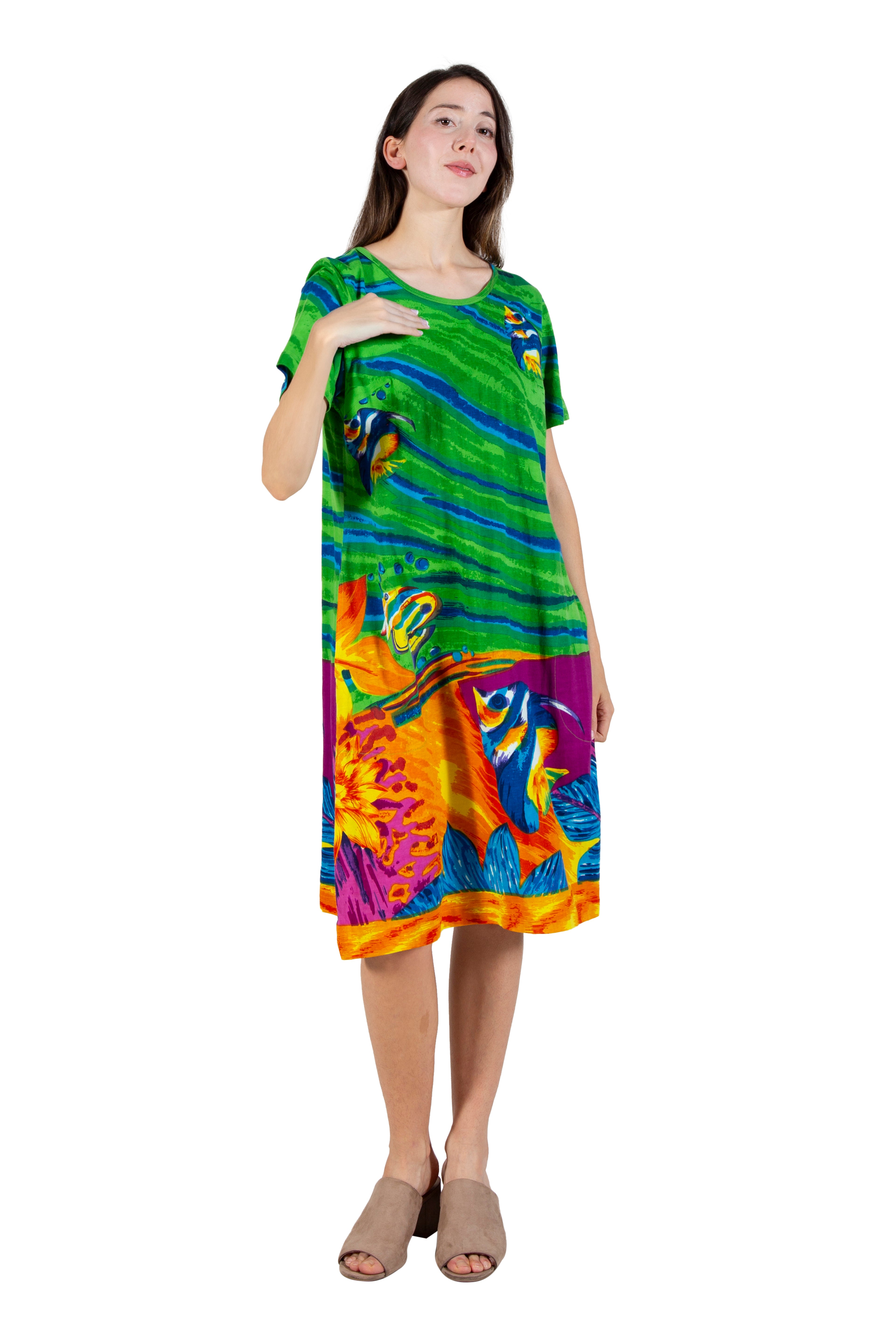 Dive into summer fun with the La Cera 100% Cotton Knit Angelfish Dress! Crafted from soft cotton knit jersey, this playful dress features a vibrant tropical sea life print that brings beach vibes wherever you go. With handy side seam pockets and a comfortable 37" length, it’s perfect for sunny days and casual adventures. Easy to care for with machine wash convenience, this dress is your go-to for effortless style and comfort.