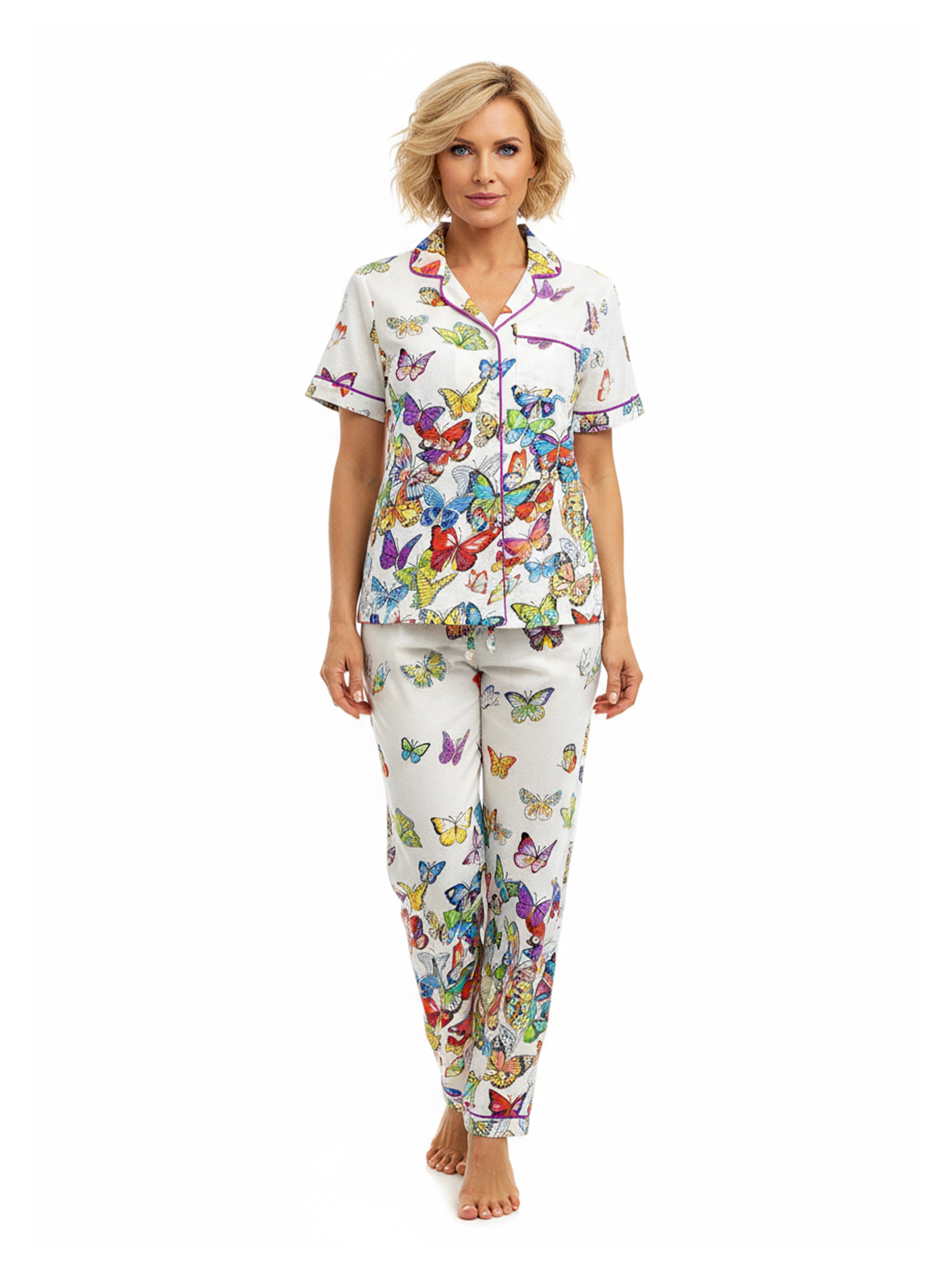 Experience ultimate comfort and style with La Cera's 100% cotton PJ set. Featuring a notched collar, functional drawstring waistband, and full button front with 5 buttons, this set is perfect for lounging or sleeping. With a beautiful butterfly garden design and cute details like a breast pocket and sleeve cuffs, you'll never want to take it off. (PJs so perfect, you'll dream about them!). Imported.