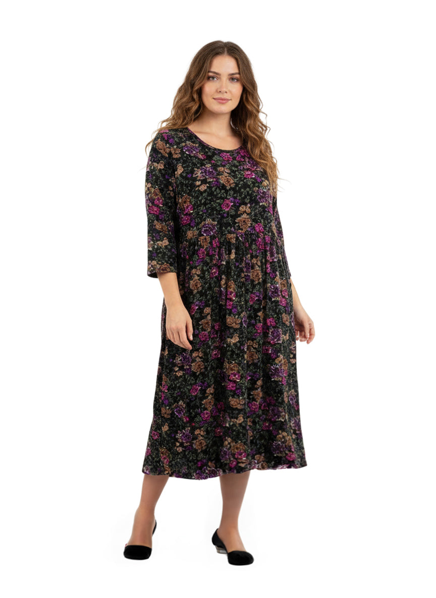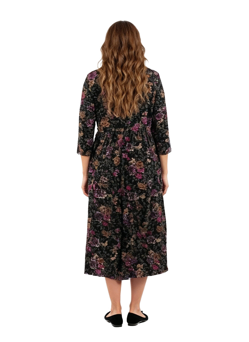 Añade comodidad y color a tu estilo con nuestro vestido de punto de algodón La Cera. Confeccionado en 100 % algodón, este vestido de silueta acampanada presenta un rico estampado floral de otoño sobre un fondo negro, cuello redondo, mangas 3/4 y bolsillos laterales en las costuras.