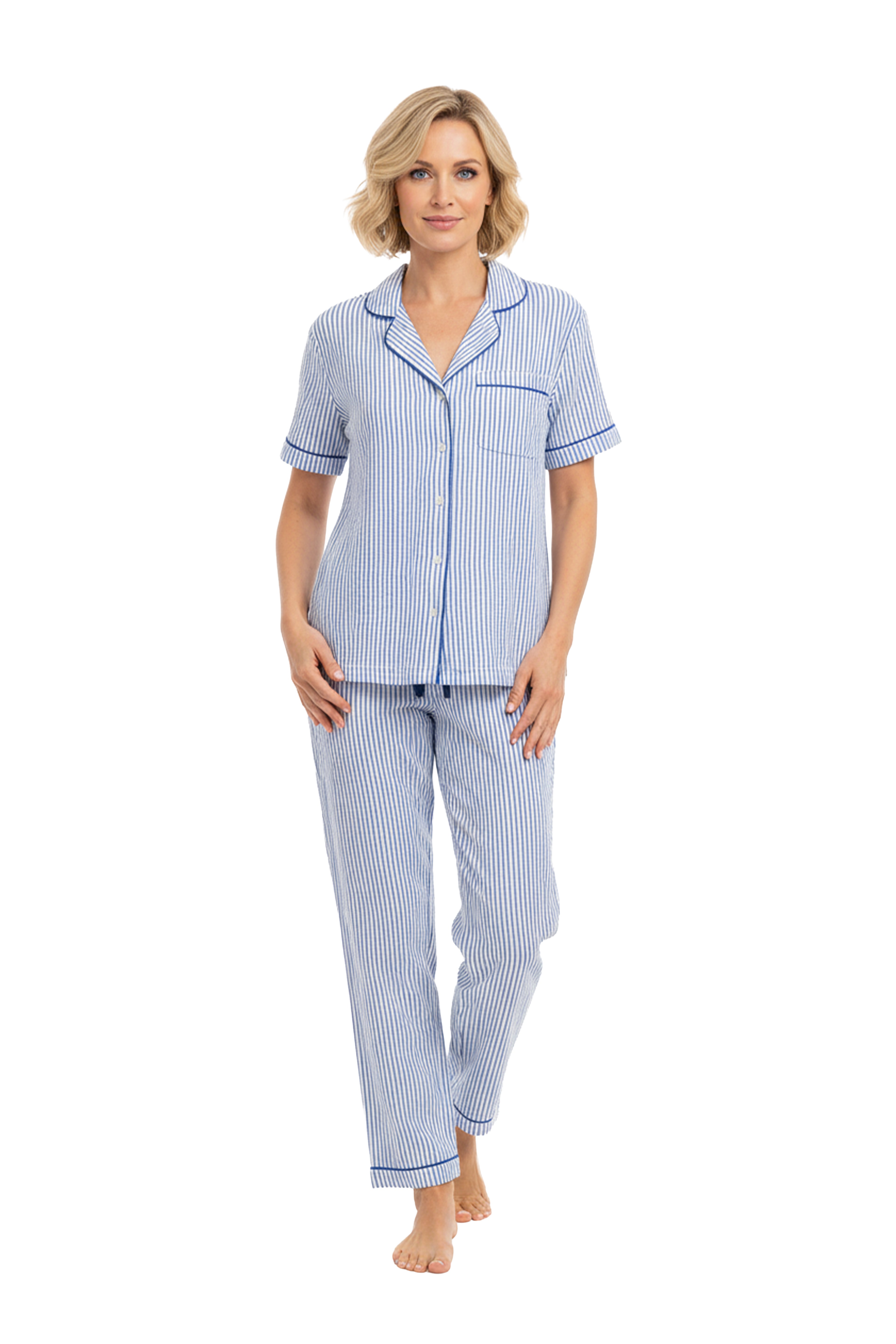 Experience ultimate comfort with the La Cera Pin Stripe Cotton Knit Capri PJ. Crafted from soft, pre-laundered 100% cotton jersey knit, these playful pajamas feature a button-front closure with solid piping and a convenient breast pocket. The elasticized waistband with drawstring ensures a snug fit, while the 25" high point shoulder to hem length and 23" inseam provide a perfect capri style. Machine washable and easy to care for, these PJs are perfect for cozy nights and lazy mornings.