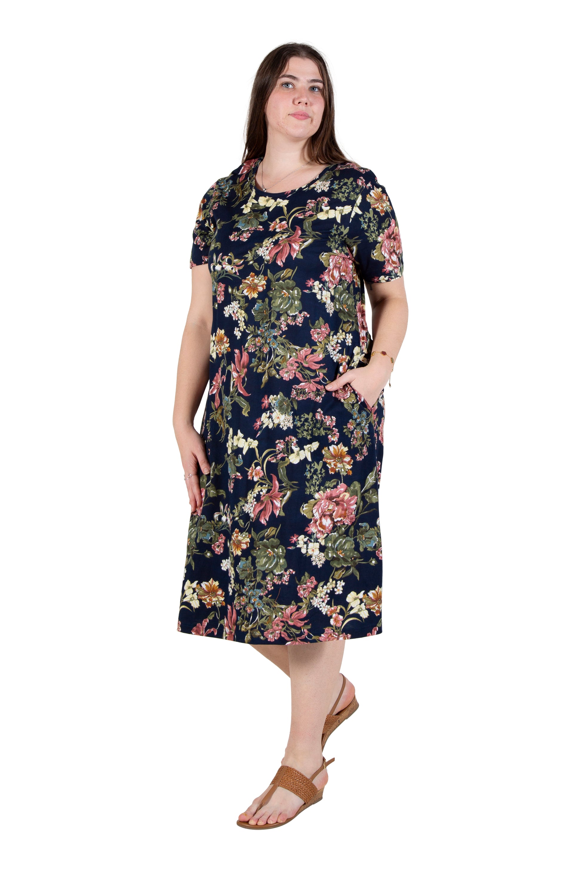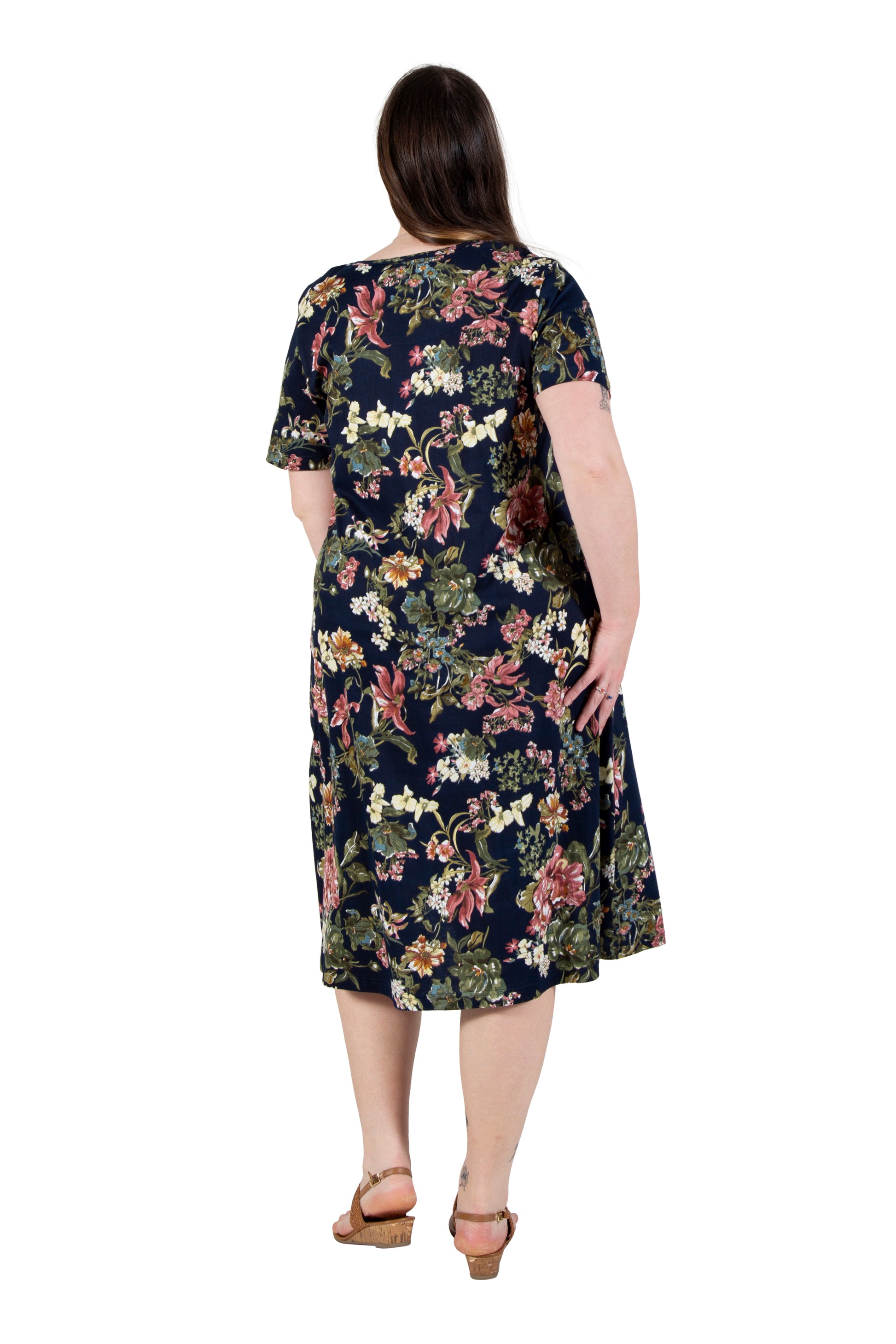 Indulge in effortless elegance with our 100% cotton jersey knit dress. Perfect for travel, its A-line silhouette and mid-calf length provide a flattering fit. Featuring side seam pockets and a midnight navy ground floral print, this dress combines style and convenience. Easy care for your busy lifestyle.