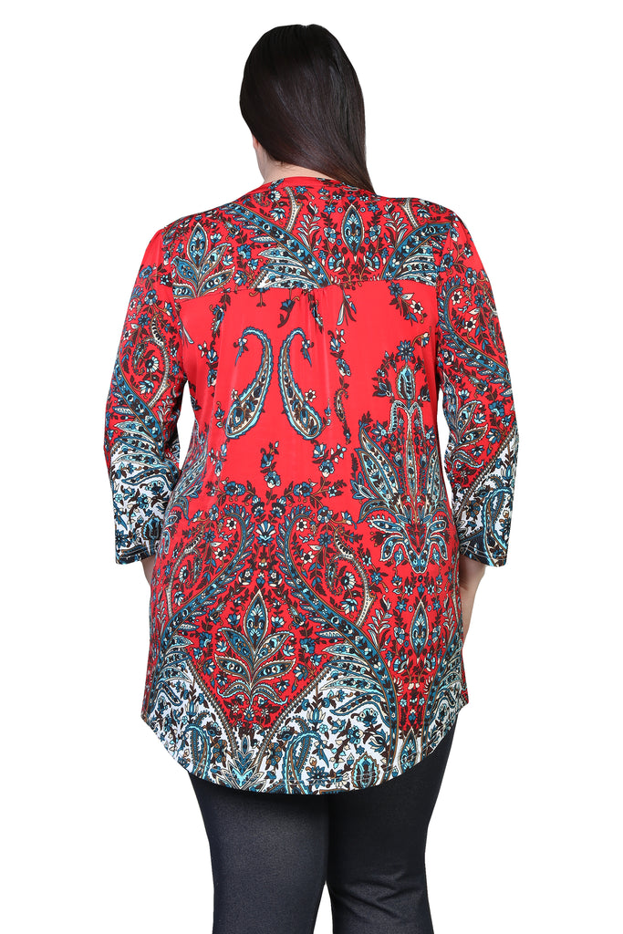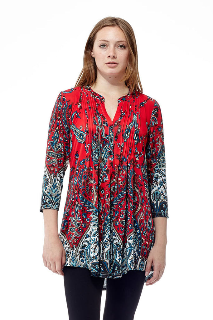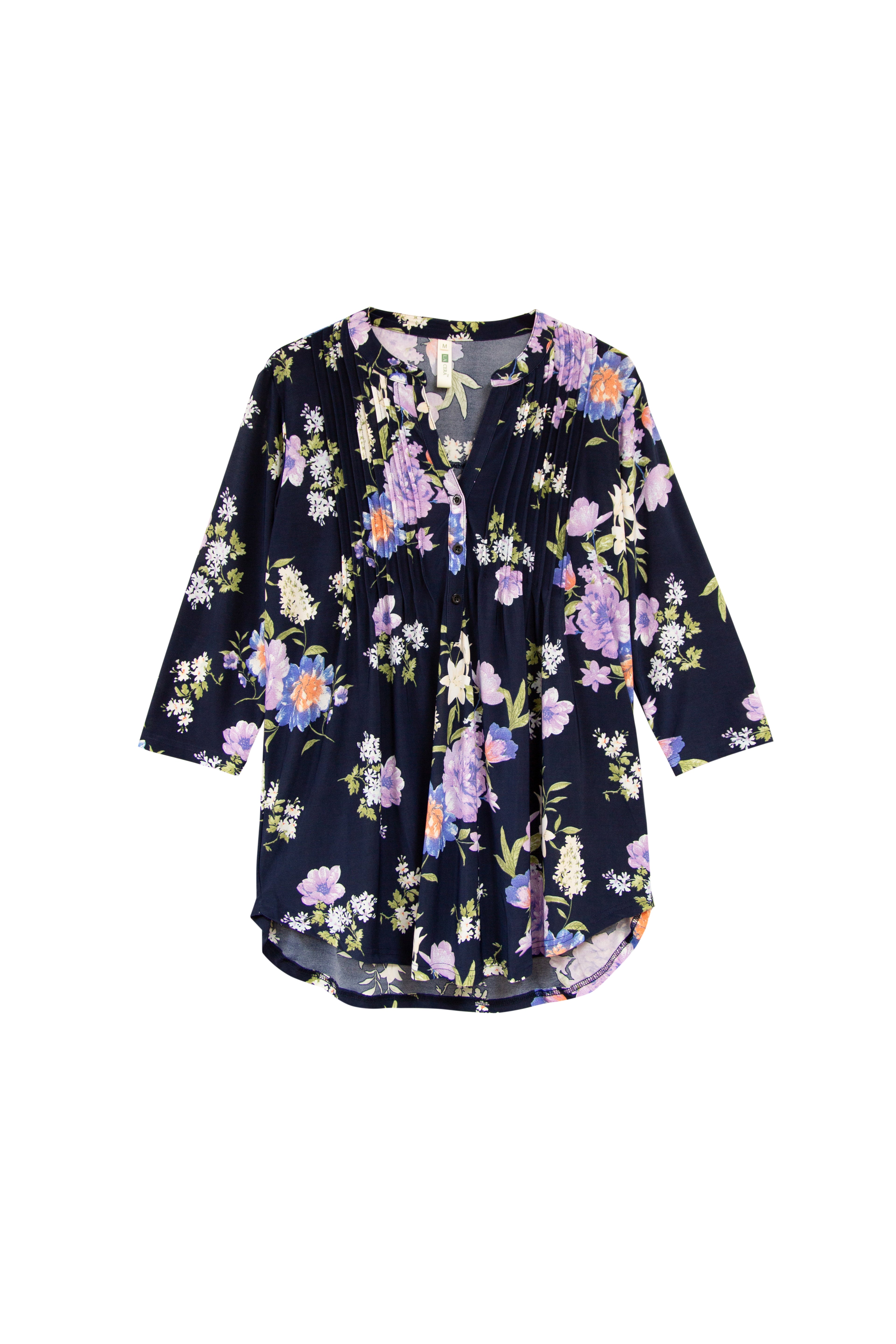 Elevate your style with our La Cera Plus Size Pleat Front Top. The sophisticated 3 button front placket and banded neckline with release pleats add a touch of luxury. Wrinkle resistant and perfect for travel, this top is both functional and elegant with its shirt tail hemline.