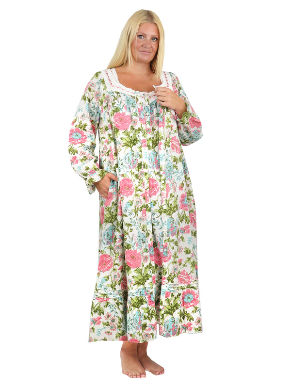 Disfrute de la facilidad de esta bata frontal con botones completos. Este modelo, adornado con una cinta de encaje de algodón en el escote, tiene mangas largas y un suave ribete elástico en el puño. La ligera tela de algodón tiene un estampado de jardín inglés repleto de flores en colores pastel. El dobladillo, que llega hasta media pantorrilla, tiene un volante completo bordeado por delicados pliegues. Se proporcionan bolsillos laterales para acomodar objetos pequeños.