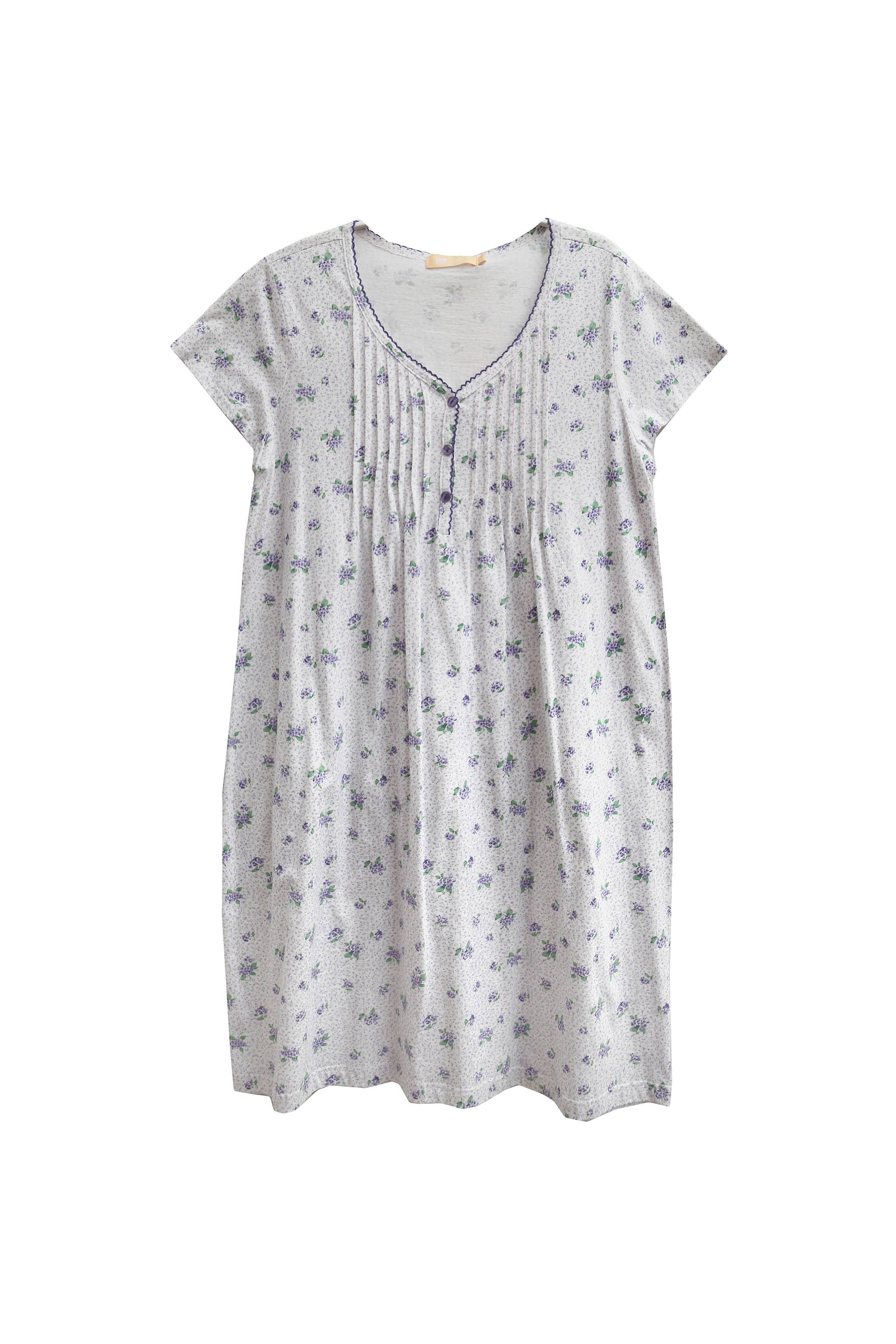 This beautiful chemise is made from a lightweight 100% Cotton Knit Jersey fabric that is strewn with dainty lilac bouquets. Has release pleats at yoke that add plenty of fullness throughout the bodice. Also features a 3 button closure and delicate picot edge trim at the neckline.
