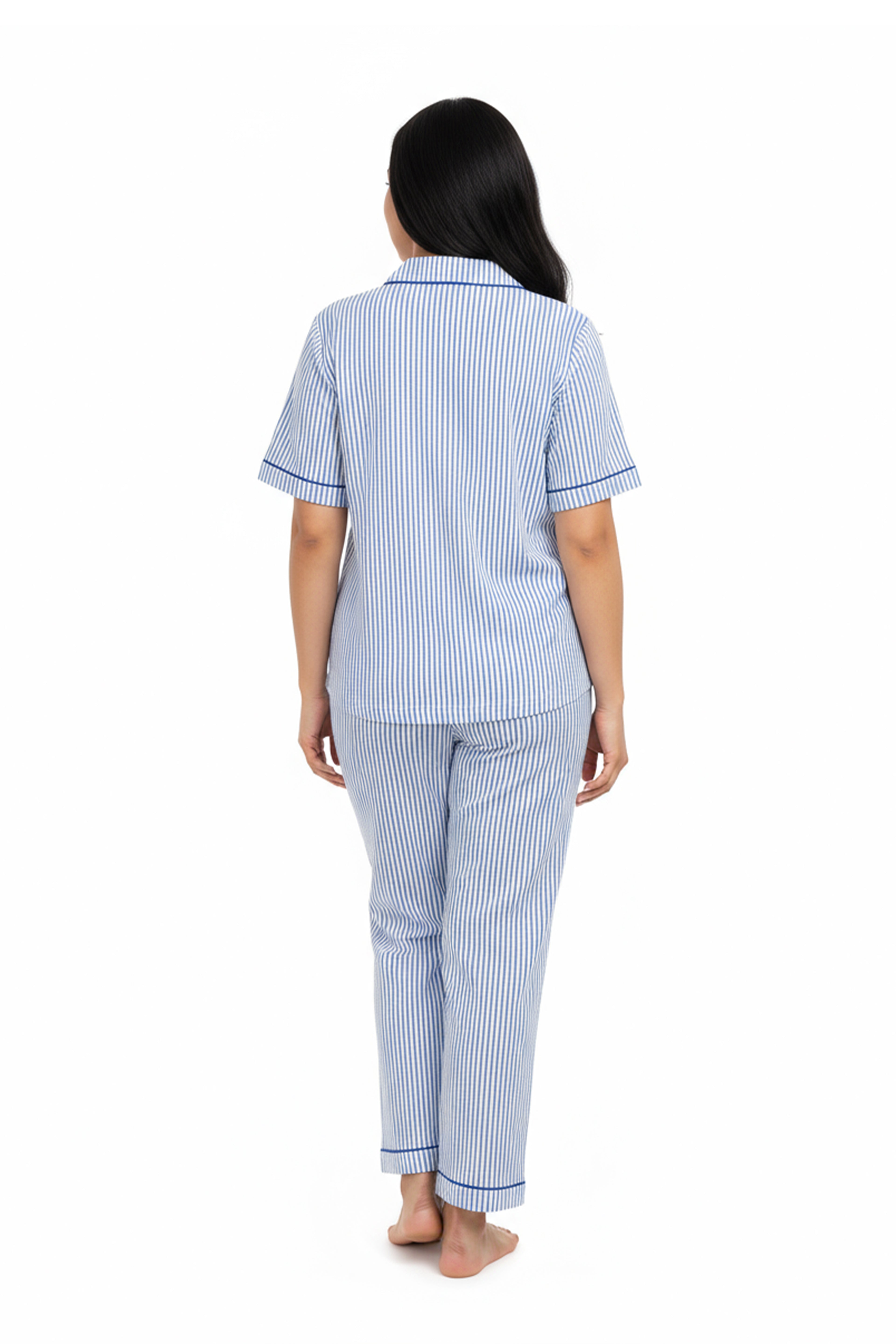 Experience ultimate comfort with the La Cera Plus Size Pin Stripe Cotton Knit Capri PJ. Crafted from soft, pre-laundered 100% cotton jersey knit, these machine-washable pajamas feature a button-front closure with stylish solid piping and a convenient breast pocket. The elasticized waistband with drawstring ensures a snug, adjustable fit. With a 27" length from shoulder to hem and a 23" inseam, these capris are perfect for playful lounging or peaceful nights.